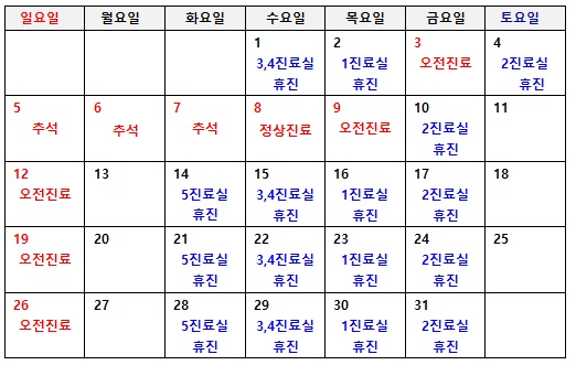 10월 5일~7일 (추석 연휴) 병원 휴진 입니다.